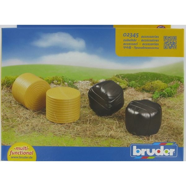 A négy szétválogatott, a kettő csomagolt (fekete) és kettő csomagolatlan (okkerbarna) körbála illeszkedik a bálacsomagolóhoz, melynek cikkszáma: 02122 (a készlet nem tartozék).