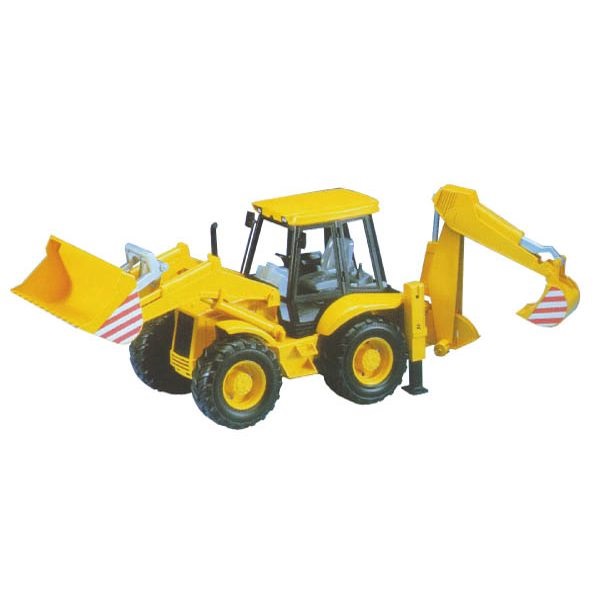 A kotró-rakodó egy teljesen működőképes front függesztésű kanalas kotróegységgel rendelkezik, mely a legmagasabb pozícióban reteszelhető. Az elülső kanál billenthető, és a vezetőülés 360°-ban forgatható. Ezenkívül a kormánykerék mozgatható. A hátsó függesztésű kotróegység szintén teljesen működőképes, vízszintesen mozgatható, 180°-ban forgatható és reteszelhető. A két kitolható talpaló biztonságos stabilitást nyújt a kotró-rakodónak, a képet a profilozott gumiabroncsok teszik teljessé. A játék fokozása érdekében a kotró-rakodó ezüst színű ikerkerekekkel szerelhető fel, cikkszáma: 02400 (a készlet nem tartalmazza).