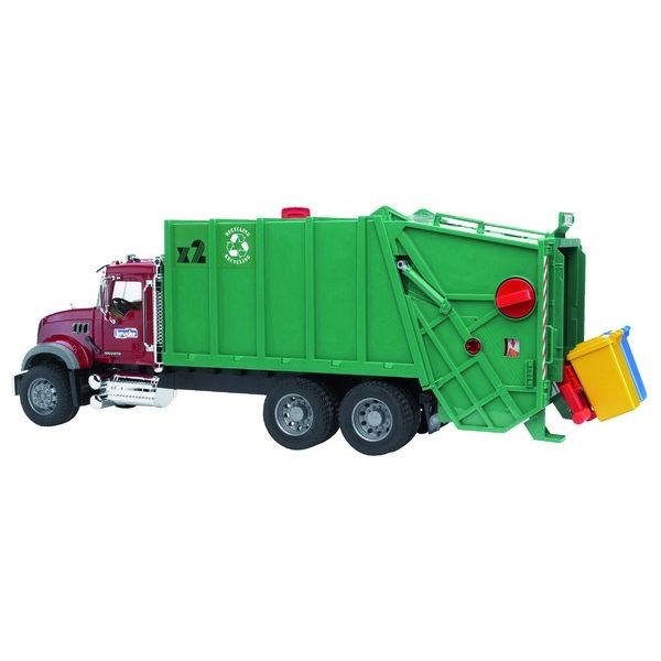 Az elképesztően valósághű fülke a nyitható ajtókkal, a billenthető motorburkolattal, mely szabad rálátást biztosít a motorblokkra, a behajtható visszapillantó tükrökkel és a számos króm hatású kiegészítő alkatrésszel igazán szemet gyönyörködtető, és nem csak a teherautó-rajongók számára. Kukásautóként a hulladékok és az újrahasznosítható anyagok elszállítása lenyűgözővé válik a gyermekek számára. A kis színes hulladéktároló edények (tartozék) vagy a szürke hulladéktároló edény (nem tartozék) ürítése a teherautó működőképes emelőjével lehetséges. A színes hulladéktároló edények és a hulladéktároló konténer nyithatók. Az eredetihez hasonlóan a hulladékot rakodótesten belül két csigaprés szállítja. Az ürítéshez ez megdől, és a nyitott hátsó fal reteszelődik.