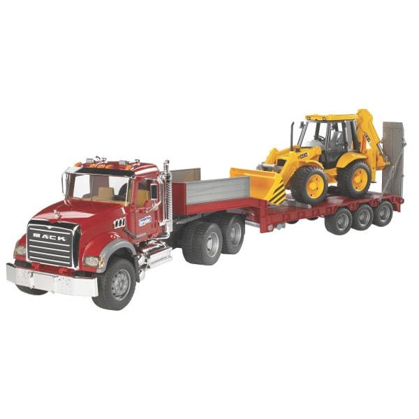 Mack Granite játék teherautó mélyrakterű kocsival és JCB kotró rakodóval, Bruder